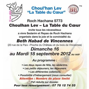 Les sédarims ainsi que tous les repas sont cuisinés par un traiteur et sont servis au centre communautaire de Vincennes. Les offices sont assurés par la synagogue située juste en face. L’ambiance se veut familiale et détendue dans le respect des lois juives. Les participants logent dans un hôtel adjacent pour plus de confort. Nous répondons ici à un besoin de réconfort loin des préoccupations pécuniaires. La table du cœur prend à charge chaque participant.