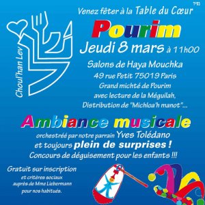 Le michté : Un grand festin est dressé pour nos convives et Charles Traiteur met tout son cœur à l’ouvrage. Ce repas avec une entrée de poisson, un plat de viande avec ses accompagnements et un dessert gourmand est servi à tous ceux qui viennent fêter avec nous Pourim.